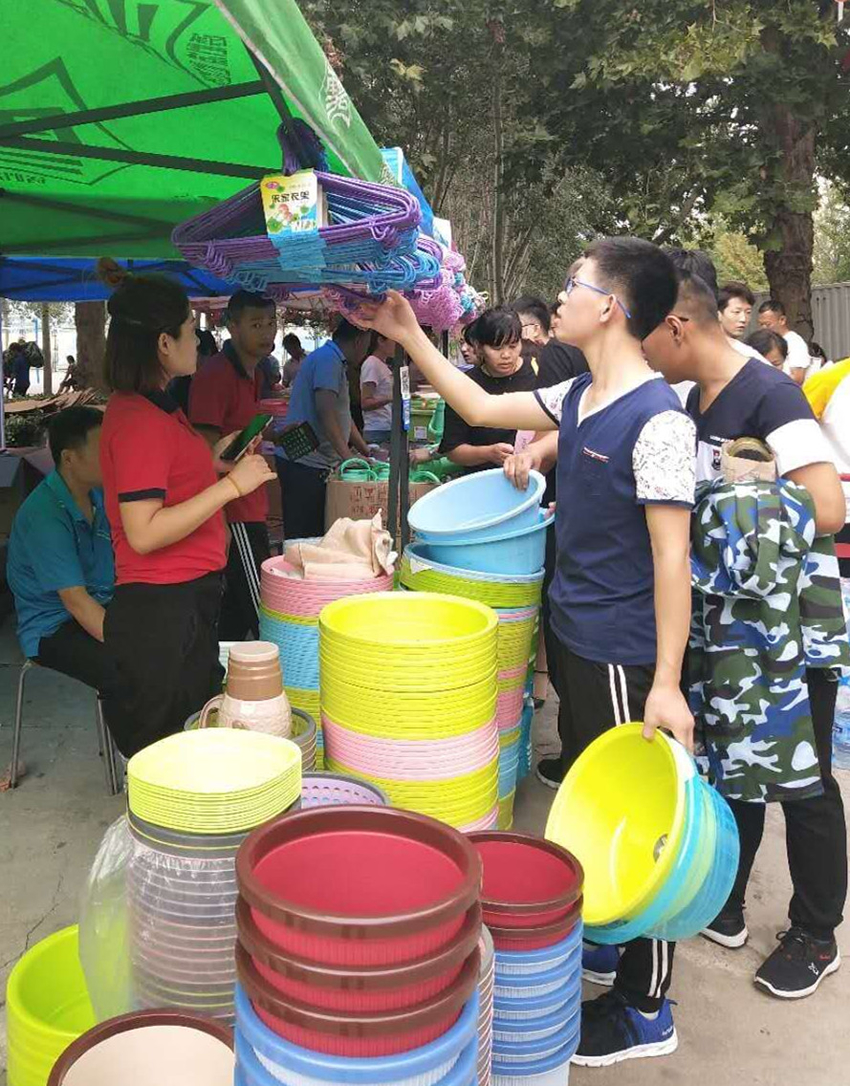 “這兩種暖瓶內(nèi)膽是一樣的,但是外殼的材質(zhì)不同,價格高的這一款外殼設(shè)計更個性一些。您放心,我們超市提供七天退換服務(wù),您可以先試用一下。”……這位耐心又專業(yè)地給新生和家長介紹商品的員工是信息學(xué)院店戴紅玉。早上六點(diǎn)多她就來到了店里,忙著收銀、搭建外場、懸掛促銷信息牌,之后又跑進(jìn)跑出,跟其他部門幫忙的同事介紹商品、價格、收款注意事項等。到了中午吃飯時間,顧客逐漸減少了一些,戴紅玉總算稍稍松了一口氣,聊起了開學(xué)季的情況。“這是俺店第一次搭建外場,沒想到外場的銷售還挺好,之前的辛苦沒白費(fèi)。”